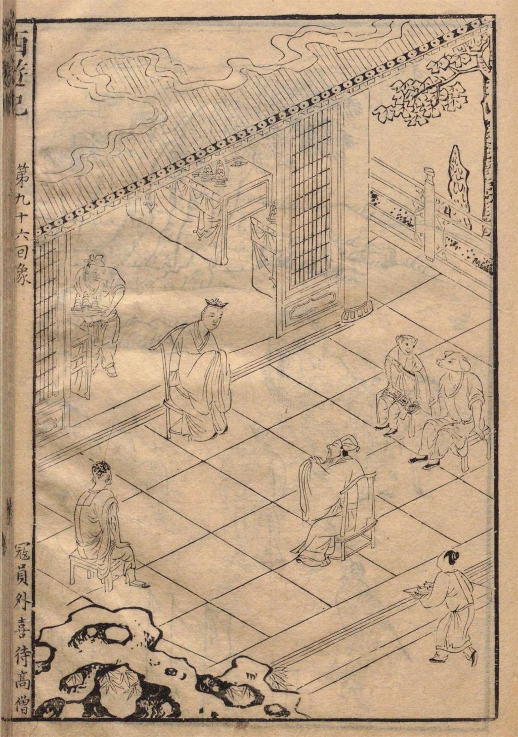 第96回 寇員外喜待高僧 唐長老不貪富貴?!独钭课嵯壬u西游記》,可能是明萬歷時期金陵大業堂刻本,書前版畫191。