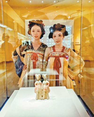 “我倆從陜西西安過來,特地穿了漢服,就是為了和‘姐妹花’合影!”展柜前,游客孫雅身著襦裙,和好友模仿女俑牽手叉腰、顧盼神飛的姿態。