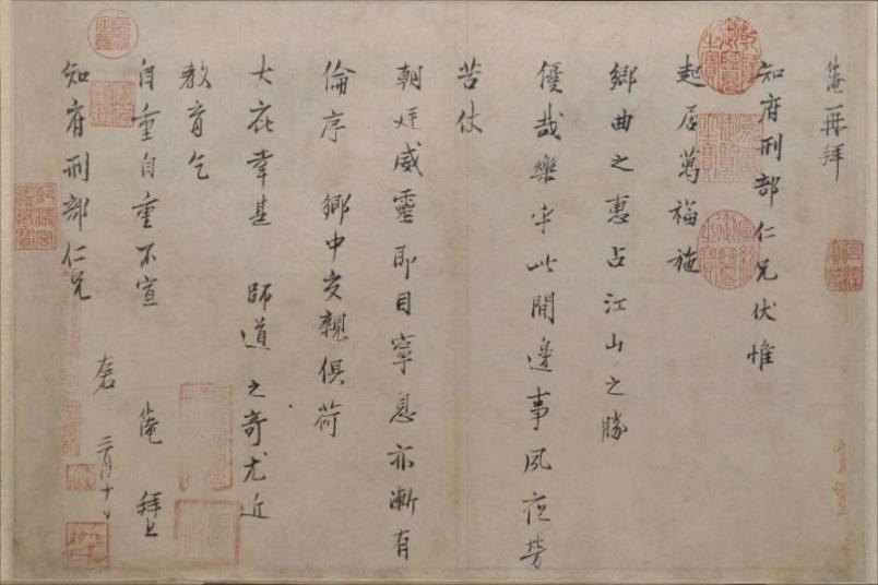 范仲淹這封信可以作為宋代標準書信格式的范本。他在信的開頭先寫了自己的名和敬詞“仲淹再拜”,然后寫了對收信人的稱呼“知府刑部仁兄”;落款時也寫了自己的名和敬詞,以及對收信人的稱呼,后面又加了一個敬詞“左右”,字面意思是“我侍奉在您左右”,最后寫了時間。
