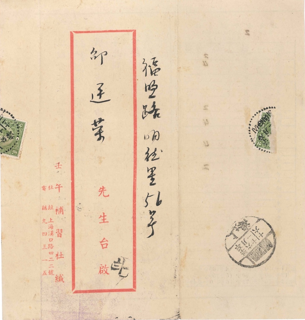 當然,這一成績單上還有幾處可注意之處:一者是邵貽裘在光華高中所上具體課程及成績,他們分別是國文(2)、英文(4)、大代數(2)、復習數學(4)、物理(4)、西洋文化(2),從成績單上的說明可知,學生的成績等第對應的分數分別是1等:90至100,2等:80至89,3等:70至79,4等:60至69。同時,這一成績單的外封上寫有“福煦路明德里56號邵廷榮先生臺啟”字樣,福煦路明德里56號無疑是邵貽裘的家庭住址,而邵廷榮當是邵貽裘的父親。此外,這封成績單寄出的時間為1942年6月,其外封上印有壬午補習社的地址是“漢口路422號”,此處的“漢口路422號”實為光華大學在抗戰中另一處寄居之地——上海證券大樓。