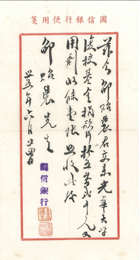 這一畢業證明文獻提供給我們一些邵貽裘的基本信息,比如他從光華大學畢業的時間為1947年的上學期,他1948年的畢業證明上寫有他二十六歲的字樣,那么,他的出生年齡就是1922年,他的籍貫為浙江慈溪等等。當然,更重要的是,通過拼合包括畢業證明在內的邵貽裘文獻,我們大體上能還原他從初中、高中直至大學的學習經歷,從1939年到1948年近九年中,邵貽裘先后輾轉于光華初中(1937-1938)、壬午補習社(即光華高中,1939-1942)、大同大學工學院(1942-1944年)、光華大學商學院(1945-1948),盡管在九年的學習時光中,邵貽裘也曾有游離在光華大學之外的經歷。但不可否認的是,光華大學及其附中一直是他學生生涯的主軸線,他的生命已然被烙上了深深的光華印記。同時,我們在這批文獻中還發現一件頗有意義的文件,一份用國信銀行便用箋寫就的光華大學復?;鹁杩钭C明,內容是這樣的: