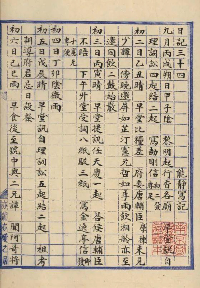 能靜居士日記五十四冊 清武進趙烈文(惠甫)撰 稿本 自咸豐八年五月初四日至光緒十五年六月二十止?;莞Χ邭q至五十八歲間日記。自咸豐八年至同治五年間書稿名“能靜居鈔”,每半頁十行,直行格本。自同治五年十二月至光緒十五年六月,書稿名“亦龍亦蠖之居”,每半頁十三行,方格本。兩種皆毛邊紙,未裝釘。