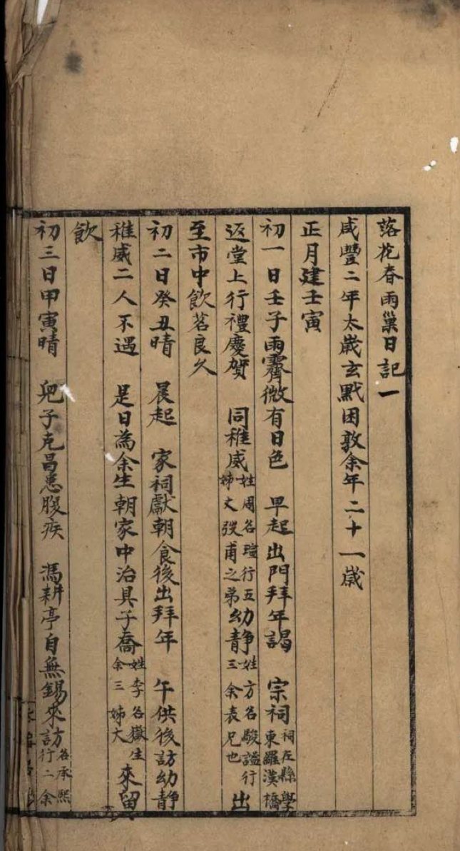 落花春雨巢日記五冊 清武進趙烈文(惠甫)撰 手稿本 惠甫早年時日記草稿本。每半頁十行,直行格次紙。自咸豐二年至五年。