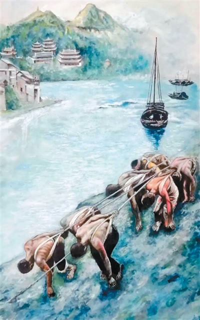 船到灘口前,無論大小,都還得請纖夫拉纖,才能頂流而上。纖繩由慈竹或斑竹的篾青編織成纜索,配上帆布肩帶,經久耐用又不勒肩。一般拉小木船的纖繩只用三股篾,若是拉小火輪或更大些的輪船,則需五股以上的篾,纜索竟有小碗粗細。纖夫們熱天干脆脫光了衣服,用一塊布兜住襠,一聲號子吼將起來:“三尺白布,嗨喲!四兩麻呀,嗬嗨!腳蹬石頭,嗬嗨!往上爬喲,嗨著著!腳蹬石頭,嗨佐,手扒沙呀,嗨佐,闖過險灘,嗨佐,好回家呀,嗨佐!”