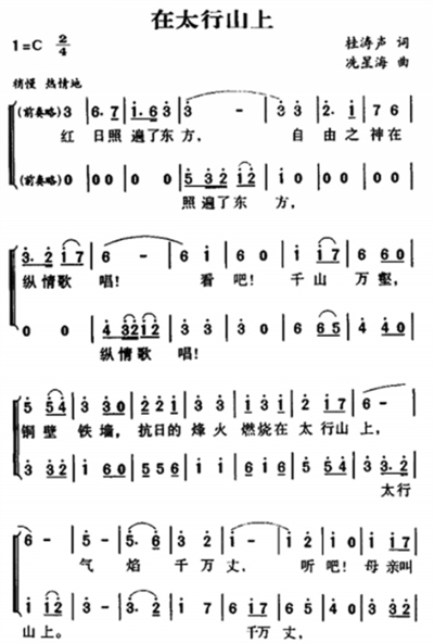 1938年6月下旬,桂濤聲回到武漢,富有鼓動性、戰斗性的抗日歌曲《在太行山上》的歌詞已醞釀成熟。南太行赭紅色絕壁從華北平原拔地而起的雄姿,以及縈繞其間決死抵抗的洶涌民情,通過他滾燙的歌詞,如同狼煙烽火,瞬間點燃了冼星海的澎湃激情。武昌曇華林國民政府軍事委員會政治部第三廳駐地,在借來的一架鋼琴上,歌詞插上了音樂的翅膀?!凹t日照遍了東方,自由之神在縱情歌唱!看吧!千山萬壑,銅壁鐵墻,抗日的烽火燃燒在太行山上,氣焰千萬丈,聽吧!母親叫兒打東洋,妻子送郎上戰場。我們在太行山上,我們在太行山上,山高林又密,兵強馬又壯。敵人從哪里進攻,我們就要他在哪里滅亡!敵人從哪里進攻,我們就要他在哪里滅亡!”