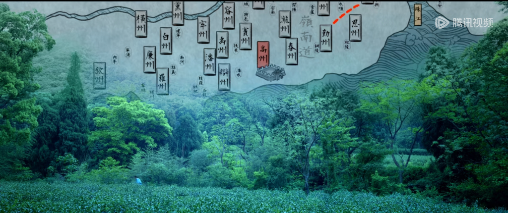 《長安的荔枝》劇照 荔枝運送路線圖。按照唐代郵驛“日行五百里”的極限速度,從嶺南到長安需十一日。