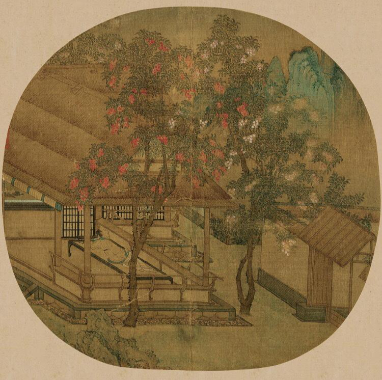 比如南宋《荔院閑眠圖》中,荔枝樹與高士休憩場景結合,體現“丹荔蔭下,心遠地偏”的隱逸趣味。一個高士倚在臥榻上,主體建筑的屋頂用修葺整齊的草排蓋成,并有障日卷簾,下邊圍以美人靠。整個亭屋顯得空靈?;鶠槭瘔K砌筑,并鋪上鵝卵石散水,與現在的日本園林建筑比較接近。對著兩棵荔枝樹,兩棵荔枝樹一株是紅色,一株是粉白色。