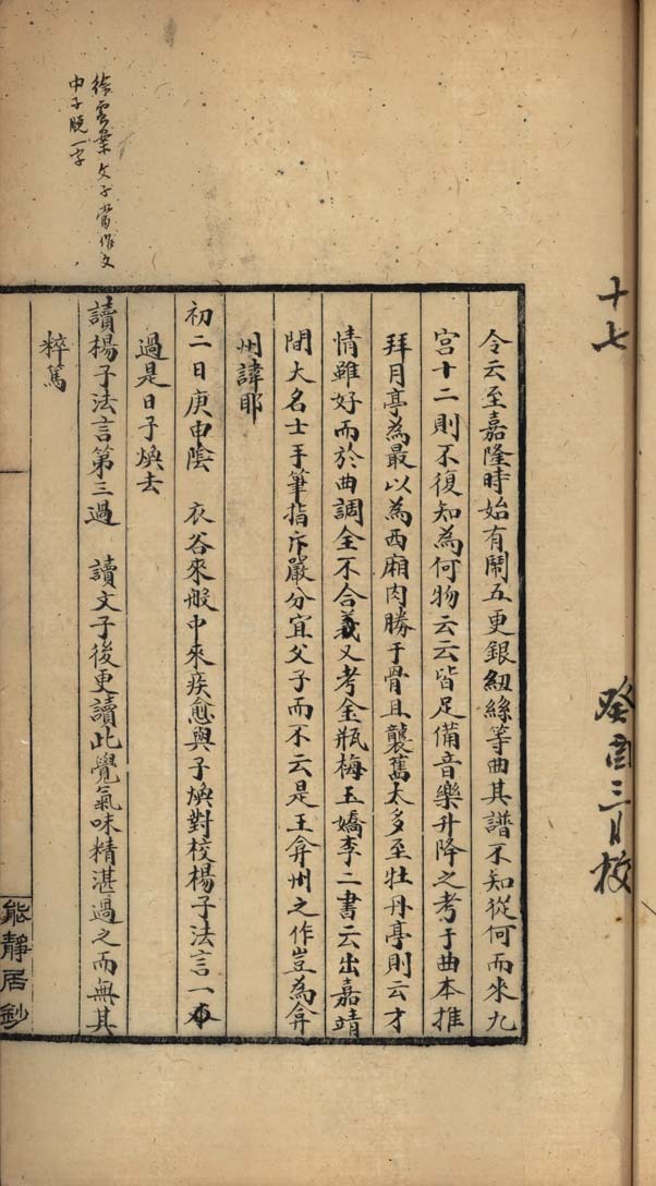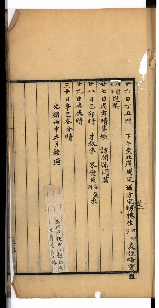 這個錄副人,絕不是趙寬。因為從南圖所藏的《落花春雨巢日記》一冊及《能靜居日記》五十四冊中看,趙寬僅僅是校對者。先看《落花春雨巢日記》。趙寬依次批有“光緒丙申五月校過”(圖2)“庚戌八月十二日?!薄拔煨缡露招!薄靶梁グ嗽率招!?,可知該日記,趙寬從光緒二十二年(1896)即開始校對,此時距趙烈文下世剛兩年。再看《能靜居日記》五十四冊。第一冊中縫有“甲辰十月?!?、冊末有“甲辰十月依原本??本箤捴斪R”,這里的“原本”,可能是趙烈文的手稿本,也可能是前引《小脈望館書目》中著錄的前一種,“甲辰”為光緒三十年(1904),這一年趙寬開始??薄赌莒o居日記》,第五冊中縫有“癸酉三月?!?,到最后第五十四冊末“癸酉十一月校畢”,可知趙寬中斷了二十八年,直到民國二十二年(1933),才開始全力以赴,用八個月的時間校完了其父日記,此時距趙寬謝世已不滿六年。