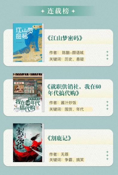 三部入選連載榜的作品《江山夢密碼》《就職供銷社,我在60年代搞代購》《割鹿記》,將歷史與幻想交織、個體書寫與時代背景融合,展現了網絡文學對敘事空間的深層探索?!督綁裘艽a》以海絲遺址為敘事母題,牽引出宋、元、民國三段縱貫千年的守護故事,兼具歷史溫度與審美高度?!毒吐毠╀N社,我在60年代搞代購》作為“系統文”與“年代題材”的融合案例,借助通俗化敘事橋段展現個體在特殊歷史背景下的自我謀劃與家庭經營,折射出網絡文學在描繪歷史轉型與社會變遷時的新型表達路徑。而《割鹿記》通過“埋尸人”獨特視角揭開大唐盛世表象之下的暗流洶涌,體現了成熟作者對歷史幻想題材更深層次的駕馭與探索。