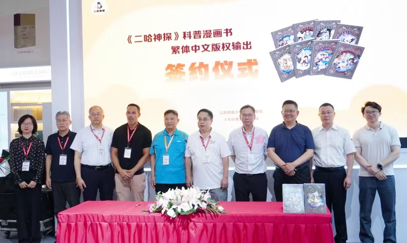 6月19日下午,《二哈神探》科普漫畫書繁體中文版權輸出簽約儀式于第31屆北京國際圖書博覽會(BIBF)江蘇綜合展區成功舉辦。本次活動由江蘇鳳凰少年兒童出版社、《七彩語文》雜志社承辦。鳳凰出版傳媒總編輯徐海,臺灣南門書局總經理張國文,南門書局旗下師友文化總經理孫玉河,首都師范大學國際文化學院學術委員會主任,教授、博士生導師王春輝,江蘇鳳凰少年兒童出版社社長王泳波,江蘇鳳凰少年兒童出版社總編輯劉宗源,《七彩語文》雜志總編輯朱念等嘉賓出席簽約儀式。江蘇鳳凰少年兒童出版社版權經理商雨奇主持簽約儀式。