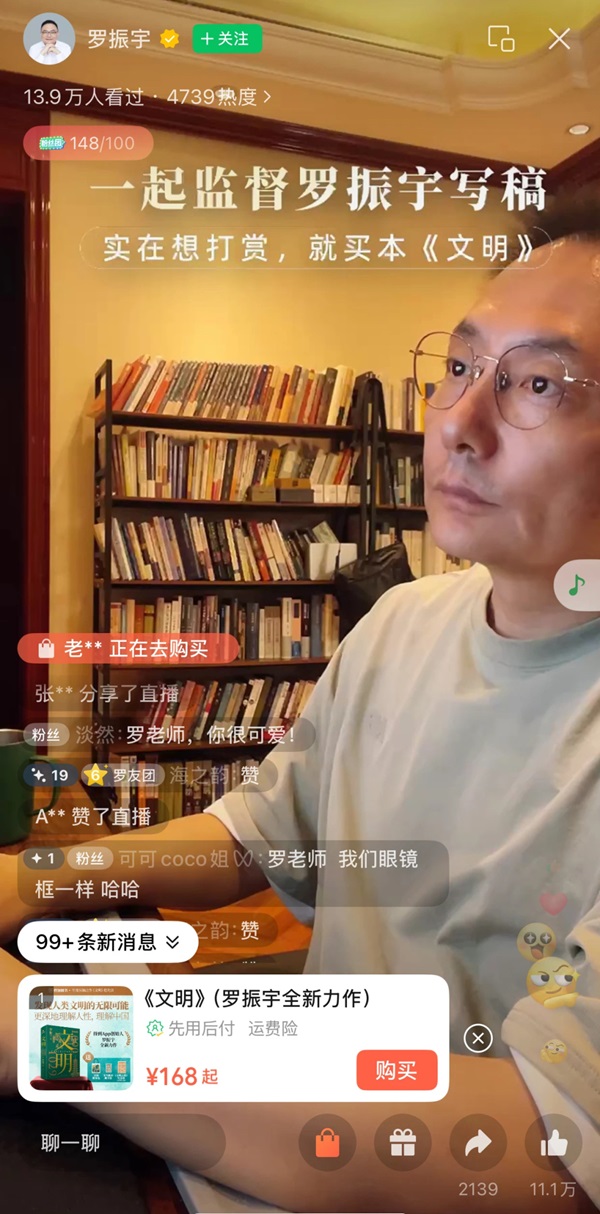 同時,羅振宇直播間屏幕上不斷跳出《文明》被搶購的成交提示,商品頁銷量顯示2700多本,更成為這種寫作直播的附加產品。