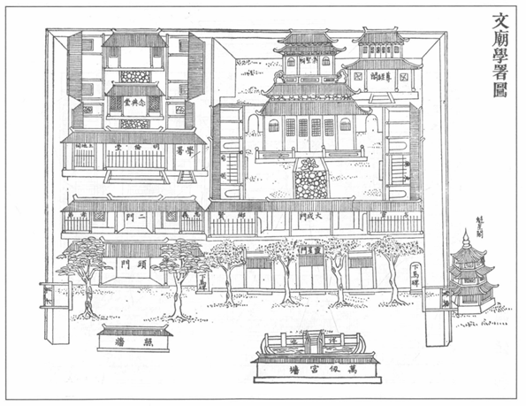 衛所建學的先例由來已久,早在洪武年間,便下詔各地衛所也一并設學:“洪武二年……天下府、州、縣各立學校,軍衛亦一并設學”,但直到洪武十四年,方才在遼東都司設立首所衛學——遼東衛學。之后截至宣德年間,衛學只是在東北和西北邊疆地區零星設置,并未在全國范圍內推廣。故而在明朝初年,衛所軍籍士人只能就學鄰近府州縣,位于今上海地區的金山衛也不例外,在此時甚至有幾人入松江府學進而登科的案例。然而到了明朝中期,金山衛官兵生齒日繁,使得衛所里出現了龐大的無需服役的軍余群體,其中佼佼者也大多投身科舉、在科場上一搏功名。而累代長于衛所的軍籍士人既無法返回原籍地參加科舉,又不可能大規模擠占就近府州縣的學額資源,衛籍士子入學成為亟待解決的問題。宣德末正統初年間,隨著海內大定、人丁滋生,朝廷詔令全國,在衛所廣設衛學:“國朝軍衛無學。宣德十年,從兵部尚書徐河之請,令天下軍衛獨治一城者皆立學。正統以來,天下軍衛延至邊徼建學,設教授、訓導,品秩俸祿如府學之制?!苯鹕叫l學便是在此政治背景下,于正統四年由巡撫御史周忱依例奏設:“衛初無學,正統已未,始令天下非麗(隸)郡縣軍衛立廟學,制與郡學同......教成而能登第者,以文階官之,使有異才者,不局于武功一途?!闭y十三年,提學劉福又在儒學西側興建文廟,奠定了衛學的主體建筑規模,之后歷代學官對于衛學和文廟多有增筑修繕,但均未超出此范疇。