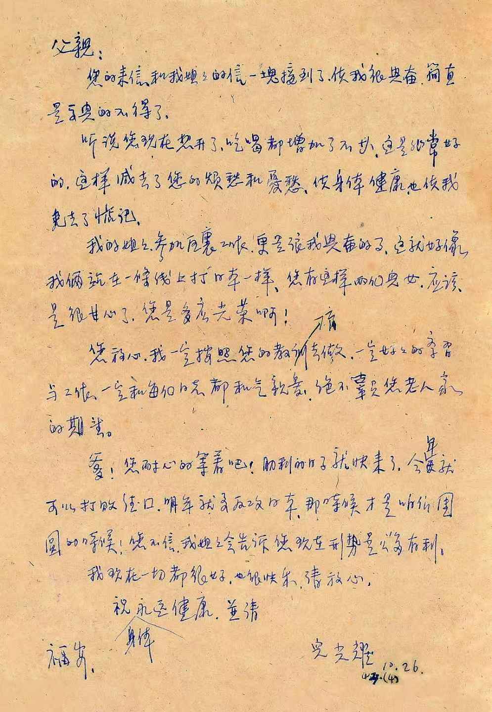 您放心,我一定按照您的教育去做,一定好好的(地)學習與工作,一定和每個同志都和氣親愛,絕不辜負您老人家的期望。