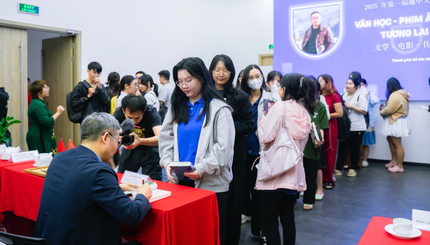 6月26日上午,東西來到胡志明市文朗大學,與越南青年讀者分享作品。他圍繞自己的作品《回響》《耳光響亮》等分享了創作經歷與體會,以廣西與越南的文化親緣性舉例,指出這種親近感使作品更容易在越南讀者中引發共鳴。在現場,東西就文學如何走向世界、如何激發青年創作興趣、文學教學方法等與大家展開廣泛交流,并為現場書迷簽名。