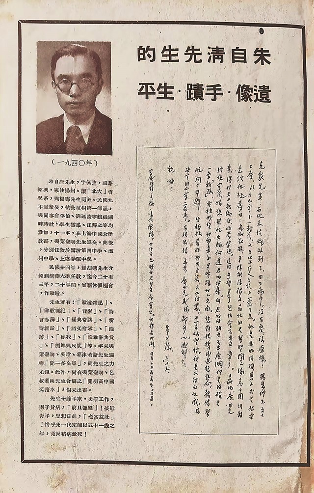 在為《朱自清先生追念特輯》專門增設的道林紙插頁上,父親做了精心的安排。右邊上方,是“朱自清先生的遺像·手跡·生平”幾個黑體字,下邊是先生1948年3月27日寫給我父親那封信的手跡。左邊上方是先生身著正裝、攝于1940年的半身遺照,下方的生平這樣寫道: