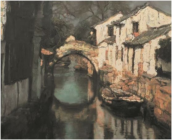 “視覺”這一文化建構經現代化發展之后,在人們的日常生活中愈發重要。隨處可見的視覺產品影響著人們的感知,陳逸飛曾將當時的上海比作一座“視覺學?!?。在他的藝術語境中,這一概念有著幾重深刻的內涵。首先,這座城市本身就是動態的視覺教材。上海灘新舊并置的都市景觀天然訓練著市民的視覺敏感性。正如陳逸飛在《海上舊夢》系列中捕捉的,每塊磚石都鐫刻著東西方視覺文化的對話痕跡。其次,上海孕育了獨特的視覺教育機制。從月份牌廣告到老電影制片廠,從旗袍剪裁到梧桐樹影的光影游戲,城市通過日常細節持續傳遞著視覺教養。這種教育并非發生在傳統課堂,而是悄然滲透在咖啡館的玻璃反光中、蘇州河的水波褶皺里,潛移默化地培養著市民對色彩和構圖的審美感知。作為一座真正的“視覺學?!?,上海最核心的價值在于其生產視覺認知范式的能力。石庫門門楣的裝飾紋樣成為解讀社會階層的密碼,外白渡橋的鋼鐵結構則成為理解現代性的媒介,這種視覺規訓不僅塑造了海派文化獨特的審美辨識度,也為陳逸飛提供重構歷史的圖像詞典——恰似他在《海上舊夢》里巧妙調用的那些城市記憶碎片。