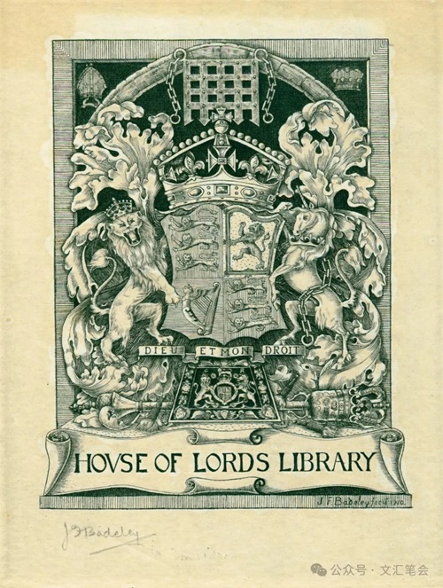 我對英國藏書票的直觀認識始于上海圖書館徐家匯藏書樓收藏的英國作家狄更斯的藏書票。1989年在上海圖書館舉辦的“89上海國際藏書票邀請展”上,圖書館提供了一批貼有藏書票實物的西文藏書,其中有一冊英文版《中國第二次戰役紀事》,此書是狄更斯的個人藏書。1870年狄更斯逝世后,其藏書被送去拍賣。這本書被不知名的競拍人買下,輾轉帶到了上海,此人是誰?此書經手了幾個人?不論有多少令我們想象的情節,此書“可說是難得的中西文化交流的實物資料”(吳興文《我的藏書票之旅》,第131頁)。這張銅版雕刻的雄獅形象作品在1840年由一位愛好文學的木匠設計,畫面采用狄更斯五世祖所獲紋章的羽飾,即獅前足所持的馬耳他十字架,抬頭蹲伏于雙色絞絲花環上,構圖十分簡潔。