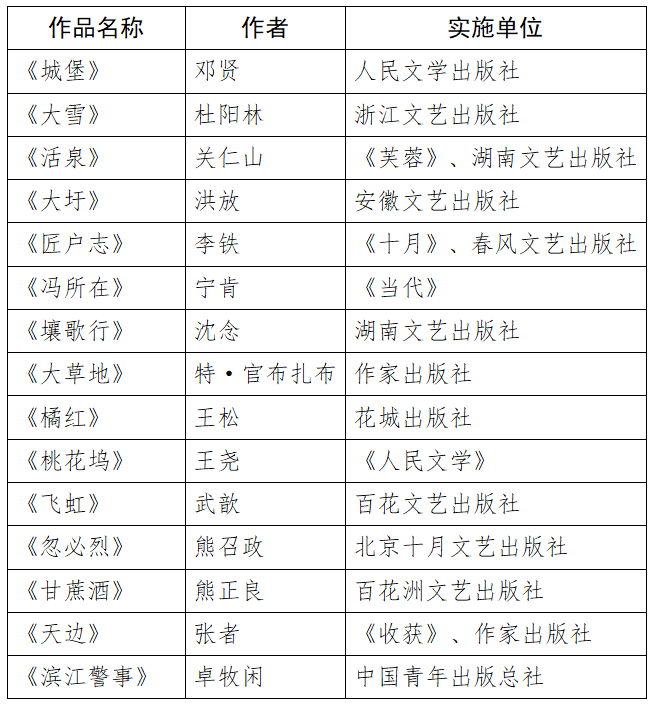 經專家委員會評審,中國作家協會書記處批準,確定了中國作家協會“新時代山鄉巨變創作計劃”2025年第1期3部入選作品、“新時代文學攀登計劃”第六期15個入選項目,現予公布。