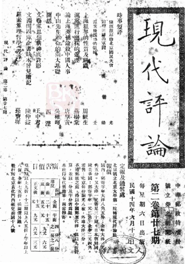 春臺小峰之爭,蓋其中還有他們的糾葛,但觀《北新周刊》所登廣告,則確已多出關于政治之小本子廣州近來,亦惟定價兩三角之小本子能多銷,蓋學生已窮矣,而陳翰笙似大有關系,或者現代派已侵入北新,亦未可知,因凡現代派,皆不自開辟,而襲取他人已成之局者也。[22](1927年7月7日)