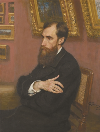 畫中的特列季亞科夫神情似乎有些疲憊,雙手環抱手臂坐在展室墻邊的椅子上,陷入沉思。列賓調亮了畫面的色調,為的是與主人黑色的外衣形成對比。列賓還著重刻畫了特列季亞科夫的右手,纖細修長的手指與挺直的鼻梁,加上深邃的眼神,凸顯他的性格和氣質。特列季亞科夫身后的墻上掛滿繪畫作品,這是列賓在告訴人們這位收藏家對俄國繪畫所做的巨大貢獻。