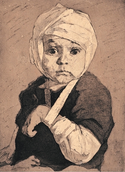 蘇聯版畫家在艱苦的衛國戰爭中,同樣延續著這種不屈的精神接力。在這片國土上出現了一大批號召人民奮勇抗戰、揭露法西斯罪行的作品。托伊澤創作于1941年的石版畫《祖國母親在召喚!》中,身披紅袍的母親振臂高呼,召喚萬千兒女共赴疆場,她手中的宣言書如戰旗飛揚,身后刺刀林立直指蒼穹。哈爾夏克的銅版畫《被法西斯炸傷的孩子》則以紀實的線條刻畫戰爭中的孩童——粗糙的繃帶與清澈的雙眸對比鮮明,無聲控訴著戰爭的暴虐,為歷史留下不容磨滅的證言。