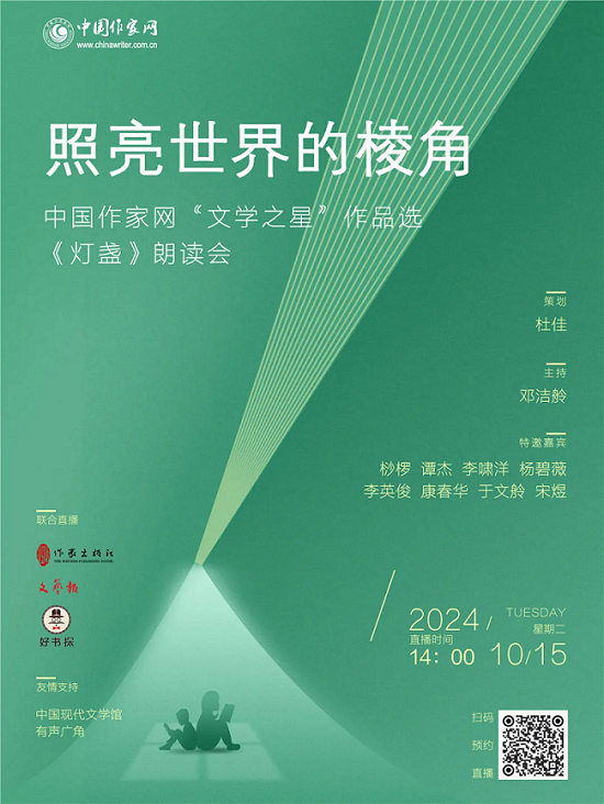 10月15日,中國作家網文學直播間舉辦了“中國作家網‘文學之星’作品選《燈盞》朗讀會”的直播活動。特邀《詩選刊》主編、批評家桫欏,魯迅文學院教研部副主任譚杰,北京電影學院副教授、青年詩人李嘯洋,魯迅文學院教師、青年詩人楊碧薇,《文藝報》編輯、青年評論家康春華,《當代》文學雜志編輯、青年作家于文舲,《燈盞》作者代表宋煜,以及中國作家網編輯、青年作家李英俊,以“照亮世界的棱角”為主題,結合當下文學熱點與具體的文學作品,從選稿與創作、點評與閱讀、出版與傳播等角度展開交流?;顒舆€邀請有聲廣角工作室的朗讀者朗誦《燈盞》中的部分作品,以聲情并茂的朗誦走進文學作品,領略文學魅力?;顒佑芍袊骷揖W編輯鄧潔舲主持。