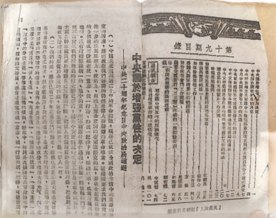 《共產黨人》是1939年10月在延安創辦的中共中央理論刊物,毛澤東為該刊題寫刊名“共產黨人”,并撰寫了發刊詞。雜志每月出版一期,總編輯為張聞天,編輯主任為李維漢,主旨為統一全黨思想、明確政治方向、鞏固黨的組織等?!豆伯a黨人》于1941年8月終刊,共出了19期。武光這本《共產黨人》就是第19期,扉頁上的“共產黨人”四個字極為顯著,左側印有“一九四一年八月出版”,目錄之后的首篇文章是《中央關于增強黨性的決定》。