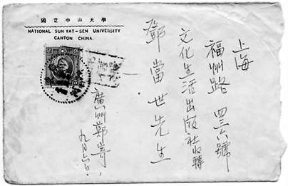 這封信使用的是國立中山大學的信封。根據史料,1934年,中山大學由原來的廣州市區文明路遷往廣州近郊的石牌。信封上的郵戳,有“廣東 廿?年九月七日 沙(東)河”的字樣,其中的“沙(東)河”為當時石牌中山大學所隸屬的郵政分局的名稱。