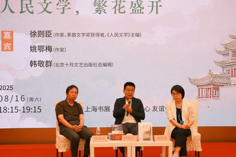 8月16日下午,上海書展活動之一“京腔京韻,海風海雨,人民文學,繁花盛開”文學對談在上海展覽中心友誼會堂舉辦?;顒佑伞度嗣裎膶W》雜志、北京十月文藝出版社、上海新華傳媒連鎖有限公司共同主辦。茅盾文學獎獲得者、《人民文學》主編徐則臣,作家姚鄂梅與北京十月文藝出版社總編輯韓敬群,共同做客上海展覽中心友誼會堂,融“京腔京韻,海風海雨”為一堂,與讀者一起聊讀書,話文學。