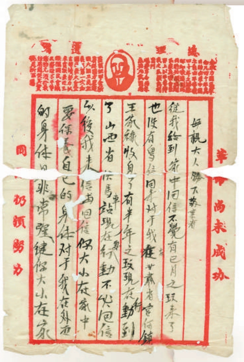 劉中新大概在上世紀二十年代末期參加紅軍,經長征到達甘肅、陜北,后在八路軍115師政治部和343旅工作。據初步考證,此4封信分別寫于1937年9月7日和1938年6月至9月間。其中的第一封家書寫于山西侯馬,當時紅軍剛剛改編為八路軍。1937年9月2日,115師由陜西三原出發進入山西境內,在侯馬稍作停留,即北上晉東北抗日前線,9月25日發起了平型關戰役。劉中新在這封家書中說:“從我接到家中回信,不覺已有月之久來了,也沒有寫信回來。對于我在甘肅省宮何鎮王家祿收(休)息了有半年之久,現在行動到了山西省侯馬車站?,F在要行動,不必回信,以后我來信再回信。你大小在家中要保養自己的身體,對于我在外面的身體是非常強健,你大小在家不必掛念……現在是全國動員抗戰的時非(候),我在外都是為了抗日救國,不能在家來孝順母親大人,以后回家再來孝順母親大人?,F在我在國民革命軍第八路軍一百一十五師政治部工作……”