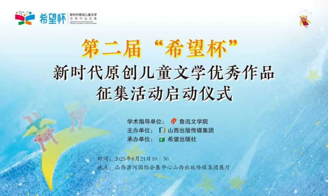8月21日上午,由魯迅文學院擔任學術指導,山西出版傳媒集團主辦、希望出版社承辦的第二屆“希望杯”新時代原創兒童文學優秀作品征集活動啟動儀式,在山西瀟河國際會展中心山西出版傳媒集團展廳隆重舉行。本次活動以習近平新時代中國特色社會主義思想為指導,深入貫徹落實習近平文化思想,緊扣黨的二十大關于文化建設的戰略部署,圍繞建設社會主義文化強國的目標,圍繞“與時代呼應 為兒童創作”的核心主題,旨在進一步推動原創兒童文學高質量發展,鼓勵創作者書寫新時代少年兒童的生活與精神世界,講好中國故事,切實承擔“舉旗幟、聚民心、育新人、興文化、展形象”的使命任務。