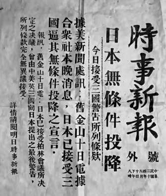 事實上,早在1945年8月10日,日本政府即已分別電請中立國瑞典、瑞士,將其投降之意愿轉達中、美、英、蘇四國,“日本政府決定無條件投降”的消息遂通過無線電波傳遍世界。當時,身處中國西南一隅的陳寅恪,究竟通過何種渠道獲知此訊,至今尚未見有確切的考證予以說明。不過,僅據筆者所知所見,抗戰期間將總部從上海遷至重慶的《時事新報》,確曾于1945年8月10日這一天下午印發過一份“號外”,日本無條件投降的消息,就赫然印于這份“號外”之上。當晚成渝兩地民眾可憑此“號外”,較早獲悉這一消息,確為事實。