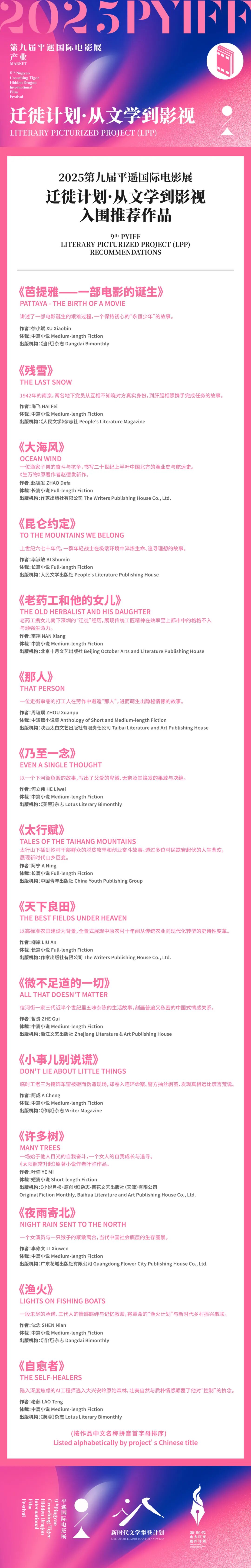 本屆電影展“遷徙計劃·從文學到影視”最終入圍的推薦作品囊括近年極具影視改編潛質且尚未進行任何影視化開發的文學精品,包括阿成的犯罪題材作品《小事兒別說謊》,海飛的諜戰小說《殘雪》,畢淑敏以親身經歷為基礎創作的軍旅文學作品《昆侖約定》,講述一部電影艱難誕生的徐小斌作品《芭提雅——一部電影的誕生》,關注時代心理疾病和AI工程師的老藤小說《自愈者》,等等。