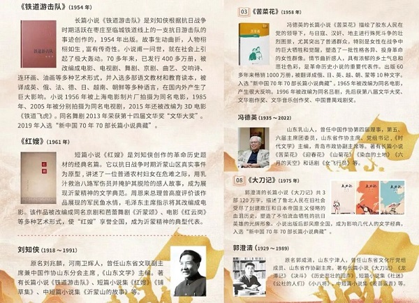 社會主義革命和建設時期,山東抗戰文學抒寫歷史記憶的文學重構。劉知俠穿越敵人封鎖線深入魯南,和游擊隊員一起戰斗和生活,搜集了大量創作素材,推出長篇小說《鐵道游擊隊》。70多年來,已發行400多萬冊,被改編成電影、電視劇、舞劇、京劇、曲藝、交響詩、連環畫、油畫等多種藝術形式,并入選多部語文教材和教育讀本,被譯成英、俄、法、德、日、越南、朝鮮等多種語言,在國內外產生巨大影響。馮德英的長篇小說《苦菜花》是革命小說的重要代表作,1956年被改編為同名電影,1996年被改編為同名呂劇,先后獲第八屆文華大獎、文華劇作獎、文化音樂創作獎、中國曹禺戲劇獎。郭澄清的長篇小說《大刀記》出版后即風靡全國,成為影響一代人的紅色經典。這3部作品2019年同時入選“新中國70年70部長篇小說典藏”。邱勛的中篇小說《微山湖上》獲1980年第二次全國少年兒童文藝創作評獎二等獎。李心田的中篇小說《兩個小八路》2018年被列入中宣部“優秀青少年讀物工程”推薦書單。還有翟永瑚的小說《民兵爆炸隊》,賽時禮的小說《三進山城》、峻青的小說《馬石山上》等一大批優秀作品,描繪了一幅波瀾壯闊的齊魯大地軍民浴血抗戰的全景圖,展現了抗戰時期山東人民的英雄氣概與家國情懷。