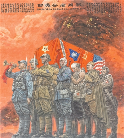 對于畫作命名,我也想了很多,但都不太滿意。直到有一天,我受冼星?!饵S河大合唱》、貝多芬《英雄交響曲》啟發,將畫作命名為《戰殞者安魂曲》——“戰殞者”指所有在抗戰中犧牲的人們。這既是對民族苦難的回望,更是面向國際社會的呼吁,希望各國以史為鑒,共促和平發展,共創人類更加美好的未來。