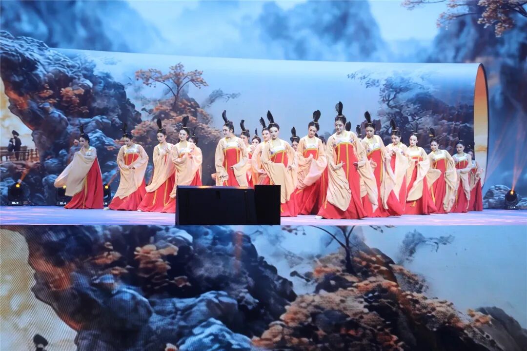 “春江潮水連海平,海上明月共潮生。滟滟隨波千萬里,何處春江無月明?!卑殡S著唐代詩人張若虛名篇《春江花月夜》中的詩句,2025國際青春詩會開幕式徐徐拉開帷幕。20余位舞者梳著高髻,身著中晚唐時流行的鵝黃寬袖對襟衫、朱砂曳地襦裙,在優美的音樂聲中緩步上臺,將扮演詩人的舞者圍在舞臺中央。衣袂翻飛,劍舞翩然。春江月色中,舞者們身姿流轉,恰似江潮連海的壯闊;氣韻澄明,宛若明月共生的浩渺。舞臺上展現出一幅詩言志、歌詠聲、舞動容的長安盛景。
