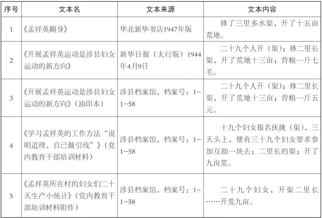 這份表格整理了涉及孟祥英與太倉村婦救主任之間交往的各類文本,包括文學作品、公開報道與政府文書,在文本生成時間序列上由近及遠,相互影響,在文本等級與流通范圍上由高到低、由廣到狹,在文本細節上,也表現出由略到詳的特點[35]。觀察表格,我們可以意識到:從數據上看,公開報道并不比文學作品來得精確,政府文書也并不比公開報道更權威。材料3是由涉縣建設科保存的報道油印件,剛好是公開報道材料2的“底本”,對比可知,公開報道對部分數據做了改動。材料5與材料4來源于同一份保存在涉縣檔案館的干部培訓材料,材料5作為材料4的附件出現。這意味著哪怕是兩份由相同筆跡抄寫、油印的材料,只因文件在形成時間與來源方面的差異,就提供了完全不同的數據。各類文本在數據層面的分歧清楚地向我們呈現出:在文本復制的過程中,數據往往并不穩定,反倒是以婦救主任的轉變論證孟祥英工作方法之正確性的敘事模式得以毫無損耗地流傳下來。也就是說,與生產經驗相比,敘事模式反而是更值得繼承的面向。