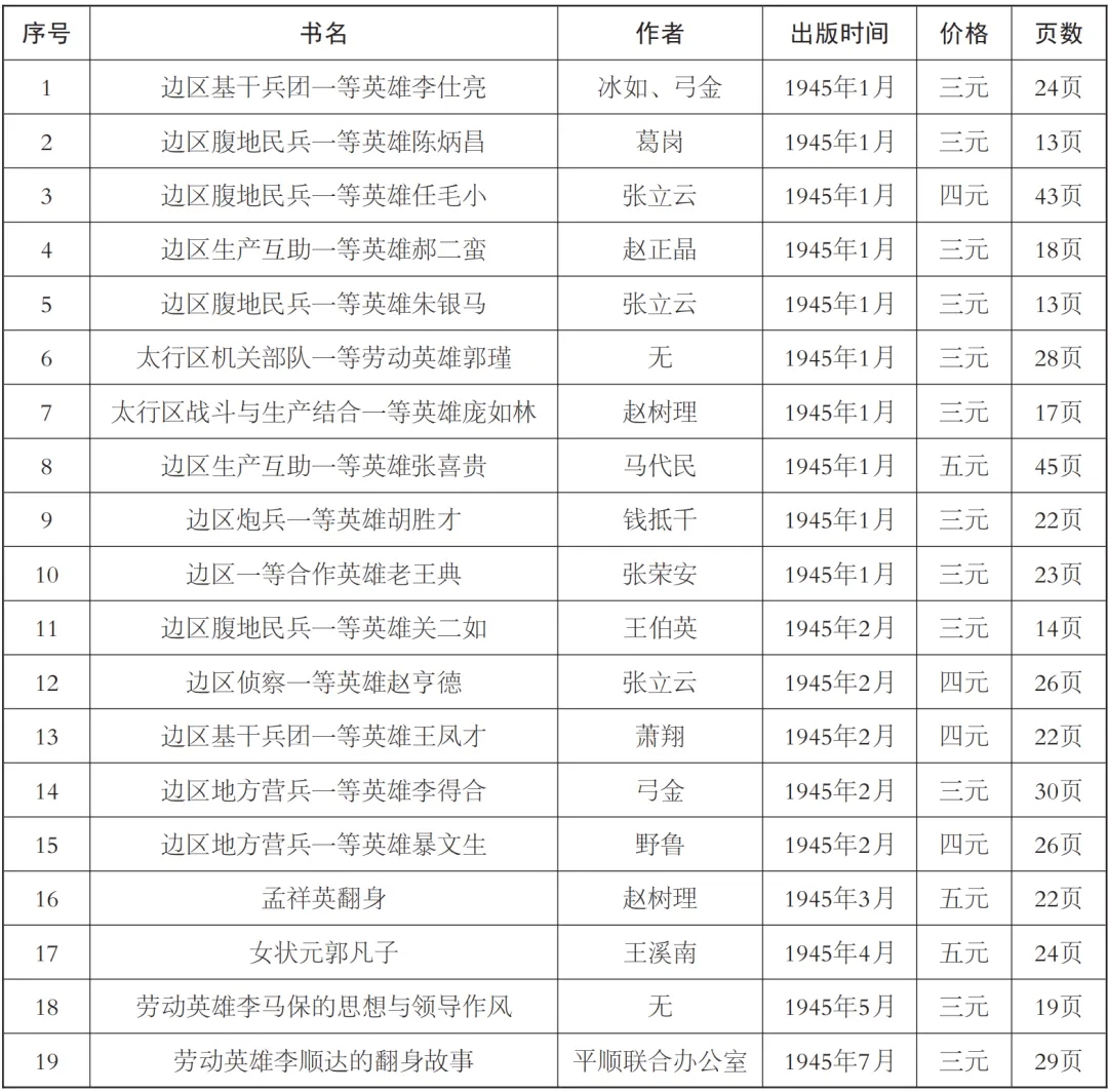 出版量從1944年的9萬冊驟然提高到1945年的45萬冊,依靠的正是這批“殺敵英雄、勞動英雄的故事以及由調查研究而寫出的文藝小冊(子)”。為了配合這一出版方面的轉向,太行區宣傳部還進行人員調整,將“書店與報社合并,文化事業委員會亦合并去報社,成為叢書編輯部”[45]。這里的“書店”就是指華北新華書店,“報社”即《新華日報》(太行版),這一合并形成的“叢書編輯部”,就是趙樹理的工作單位。此后,群眾/通俗讀物與干部讀物成為根據地出版工作的常用區分,1946年新成立的冀南書店就直接將編輯部分成干部讀物組和通俗讀物組,并規定“通俗讀物占全部出版物的三分之一”[46]——群眾讀物體系的建設無疑成為解放區出版工作的重要發展方向。
