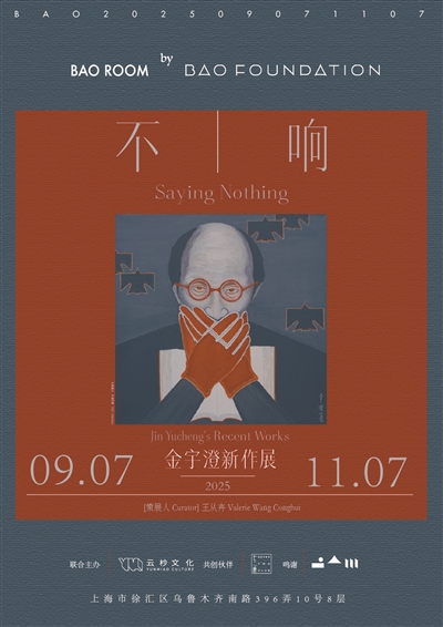 2025年9月,金宇澄在上海珍寶藝術基金會舉辦名為“不響”的畫展,畫展的海報用了和畫冊一樣的自畫像,畫中的金宇澄戴著紅框眼鏡和紅色手套,兩只手捂住了自己的嘴巴。這畫似乎將“不響”具象化了,帶著某種戲謔的態度。