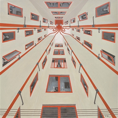 我覺得我畫畫還是興趣在推動,沒明確要在畫上完成什么,就是拿來就用。比如去年,我畫了一幅自畫像,這幅畫中還有一個十字形的建筑,我發現這個建筑的十字上,好像是章魚的觸角,這個觸角就是這幢建筑的排水管道,紅色的章魚在十字建筑一個個缺口往下看,八根觸須通向各家各戶……