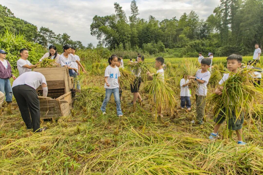 開鐮了!在家長的帶領下,《搖籃》寶寶們有的揮動鐮刀割稻子,有的給在打谷機邊忙碌的家長運送稻子,有的埋頭撿拾散落在田間的稻穗,有的扎草垛和稻草人,稻田里到處是忙碌快樂的小身影。經過一個下午的緊張勞動,秋收任務終于完成。
