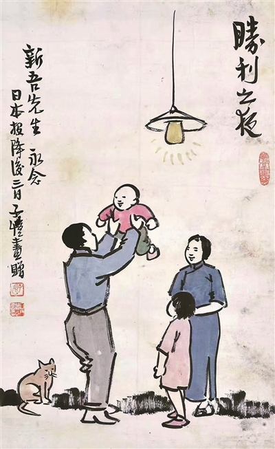 1945年8月10日,當電臺里傳來日本接受《波茨坦公告》全面無條件投降的消息時,重慶的大街小巷人們奔走相告,慶祝勝利的鞭炮聲此起彼伏。當時避居山城的豐子愷,有感于此,繪制了《卅四年八月十日之夜》——父親喜不自禁,將孩子高高舉過頭頂,象征光明和勝利的燈光照亮畫面。豐子愷通過一個家庭的溫暖瞬間,描繪了抗戰勝利之夜的人民心聲。隨之,豐子愷在此基礎上再繪《勝利之夜》,畫面中的紫衣男孩換作笑容溫婉的母親。9月2日,日本代表在美軍“密蘇里”號軍艦簽署無條件投降書,豐子愷即作《炮彈作花瓶 萬世樂太平》——桌面上的炮彈殼成為花瓶,寓意和平的荷花插入其中,兩個兒童玩具倚放其旁,展現了他對世界和平的美好祈愿。