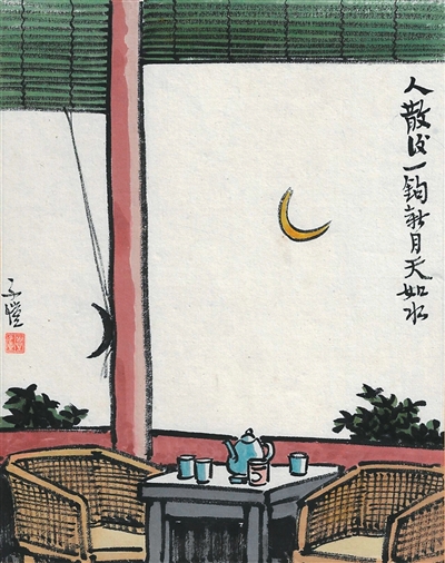 之所以是“古詩新畫”,在于豐子愷在研讀古代詩文時,真切感受到其穿越時間的魅力。宋代蘇軾提出“詩畫本一律”之說,明確了詩畫相通的理論。豐子愷在《畫中有詩》自序中談道:“余讀古人詩,常覺其中佳句,似為現代人生寫照,或竟為我代言。蓋詩言情,人情千古不變,故好詩千古常新?!本拖衿涑擅鳌度松⒑?,一鉤新月天如水》,就源于宋代詞人謝逸《千秋歲·詠夏景》中的最后一句。