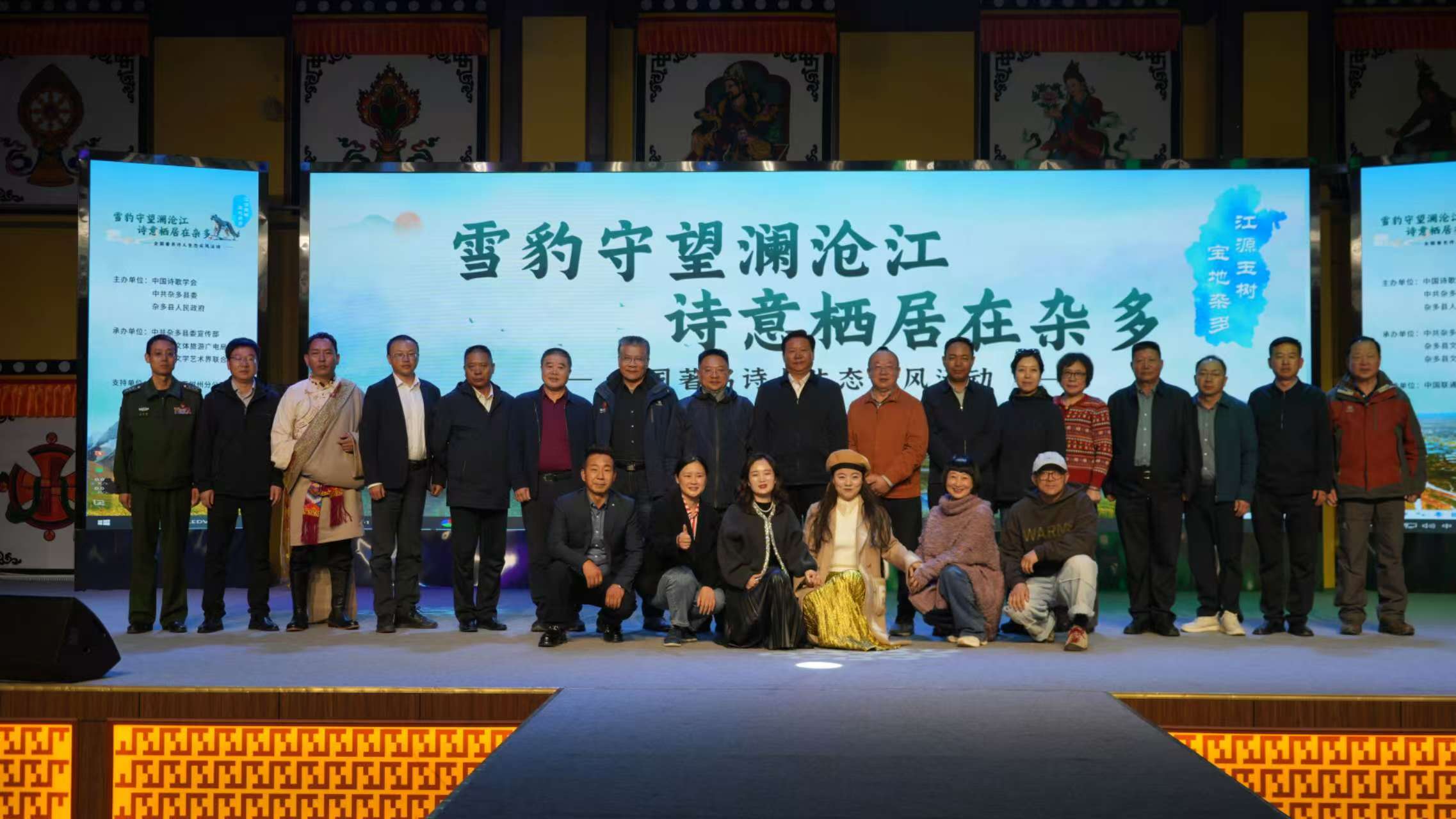 雜多縣縣委書記趙邦彩與中國詩歌學會黨支部書記王山共同為“中國雪豹詩歌創作中心”揭牌,這是全國首個以“雪豹保護”為主題的詩歌創作與研究基地。雜多縣委副書記、縣長更陽表示,雜多是習近平總書記曾視頻連線關懷的地方,我們當牢記囑托,讓生態保護與文化振興同頻共振,探索“綠水青山”向“金山銀山”轉化的詩意路徑?;顒又?,詩人們欣賞了雜多縣文藝工作者們表演的男聲獨唱《寶地雜多》、歌舞《格仲鍋莊》、格薩爾舞臺劇選段《達色牦牛(財寶)宗》等。參加采風活動的詩人和本地詩人還朗誦了《青春萬歲》《字的高度》《一滴綠水》《美麗富饒的雜多》等15首作品。