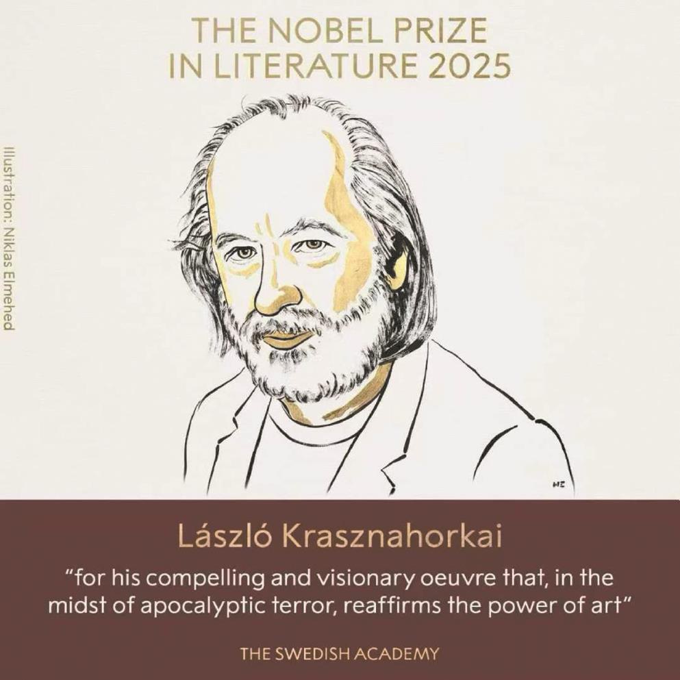 “他那震撼人心、富有遠見的創作,在災難與恐懼中,重申了藝術的力量?!北本r間10月9日晚,2025諾貝爾文學獎在瑞典斯德哥爾摩揭曉,71歲匈牙利作家拉斯洛·克拉斯納霍爾凱獲獎。