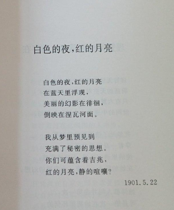 白色的夜,紅的月亮/在藍天里浮現,/美麗的幻影在徘徊,/倒映在涅瓦河面。/我從夢里預見到/充滿了秘密的思想。/你們可蘊含著吉兆,/紅的月亮,靜的喧嚷?(《勃洛克抒情詩選》,汪劍釗 譯)