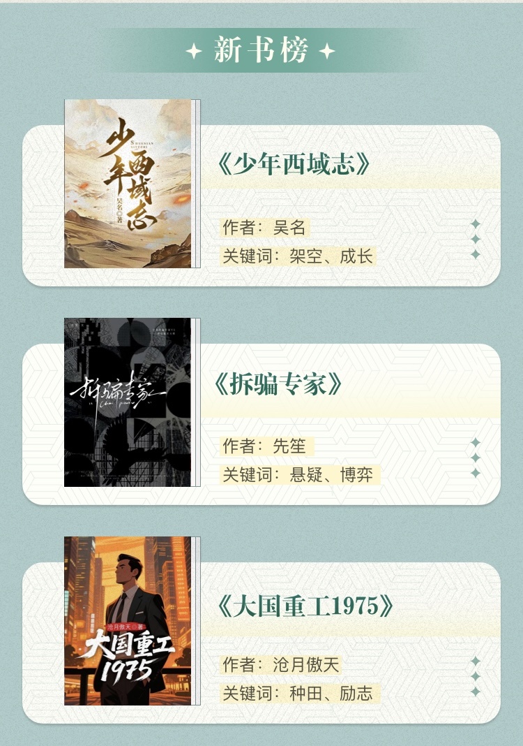 在新書榜中,三部新作對敘事與結構實現了新的創新與突破?!渡倌晡饔蛑尽窂莫毺氐奈饔蛞暯沁M行武俠創作,是武俠創作中少有的一次突破性類型融合實踐?!恫痱_專家》創新采用雙視角敘事手法拓展刑偵文學的創作維度,以立體人物構建現實隱喻,深刻體現了網絡文學直面現實、剖析人性的創作自覺?!洞髧毓?975》將“重生”敘事與工業史詩有機融合,不僅打破了網絡文學“輕娛樂”的固有認知,更以民族記憶與時代發展為創作根基,為題材創新提供了兼具思想深度與文化厚度的實踐范式。