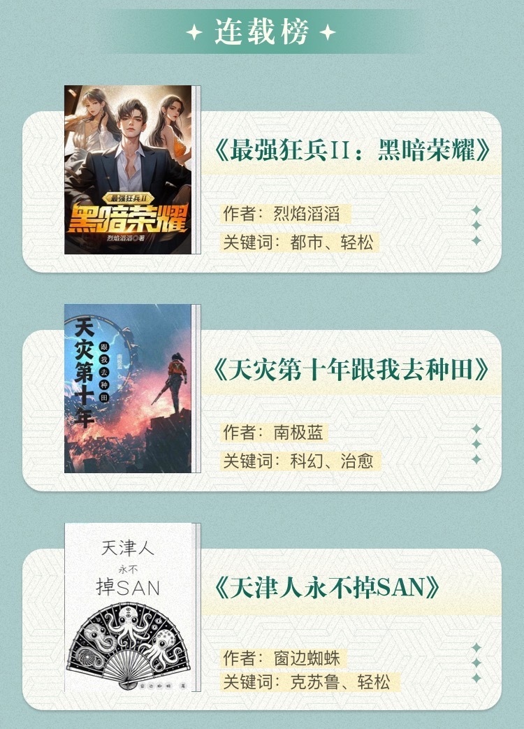 連載榜的三部作品,憑借新穎有趣的題材持續獲得廣泛關注?!蹲顝娍癖颍汉诎禈s耀》作為經典男頻網文《最強狂兵》的續作,延續前作構建的世界觀,將家族復興的主題與都市異能結合,并融入許多新興勢力,成功拓展了題材邊界,為類型創作注入了新鮮活力?!短鞛牡谑旮胰シN田》立足末日語境,主角夏青于文明傾覆十年后開啟破局之旅——以農業為根基復蘇生產力,以社群為紐帶重建社會契約,在廢墟之上踐行人類文明的延續使命?!短旖蛉擞啦坏鬝AN》以克蘇魯為題材,將西方恐怖敘事與天津地域文化成功結合,將克蘇魯風格實現了本土化改造。