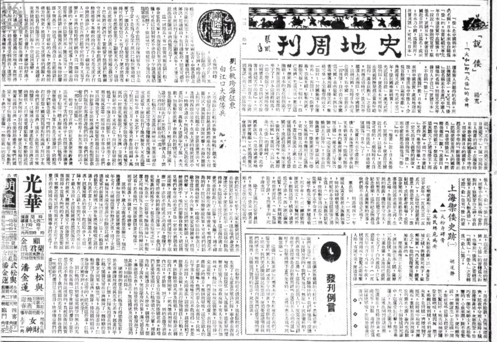 《史地周刊》第一期,刊頭由蔣大沂學習考古的老師張鳳題寫,刊登了三篇文章。第一篇是楊寬的《說倭》,考證倭國向漢唐稱臣、日本國名的由來、“大和”即“大倭”的音轉等史實。第二篇是蔣大沂寫的通俗史話《劉仁軌跨海征東,白江口大破倭兵》,講的是唐高宗時候的將領劉仁軌在朝鮮半島擊敗日本軍隊的故事。作者認為劉仁軌之所以能夠成功,“全倚仗著他一股子肯硬干的傻勁”。第三篇是胡道靜的《上海御倭史跡》,介紹了上海群忠祠的由來,特別介紹了上海守城民夫楊鈿與倭寇同歸于盡,挫敗其偷襲陰謀的故事。當時《文匯報》雖持抗日立場,但大部分稿件都不署名?!妒返刂芸穭摽窗l表三篇支持抗戰的署名文章,體現了三個年輕作者的非凡勇氣。這三篇文章一重考證,二重通俗歷史,三重地方歷史,在類型和內容上奠定了《史地周刊》的基調。