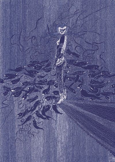 由于寫詩時忍不住在稿紙邊緣涂畫,從此,丁捷便開啟了“詩畫同行”的創作。出差時在賓館信封上的隨手涂鴉,如今已攢下三四百張,盡數捐給母校江蘇省海安高級中學的文學藝術館;面對0.8米到2米高的畫幅時,僅靠一支細針管筆,以成千上萬筆細細渲染,一旦落筆出錯便無法挽回。在別人看來難以堅持的過程,在他看來卻是一種“靈魂”的沉浸。